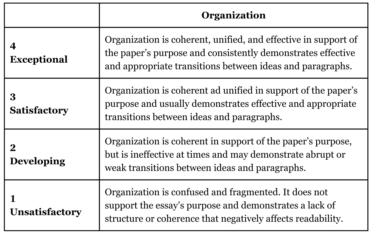 This common rubric (for a student writing assignment) lists criteria for completion in the left column and evaluation levels across the top. The cells of the grid explain in detail what the teacher will be looking for when they evaluate the work (Roell, 2019).
