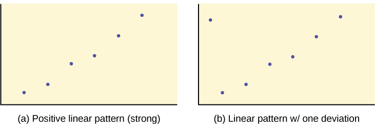 In this chapter, we are interested in scatter plots that show a linear pattern. Linear patterns are quite common. The linear relationship is strong if the points are close to a straight line, except in the case of a horizontal line where there is no relationship.