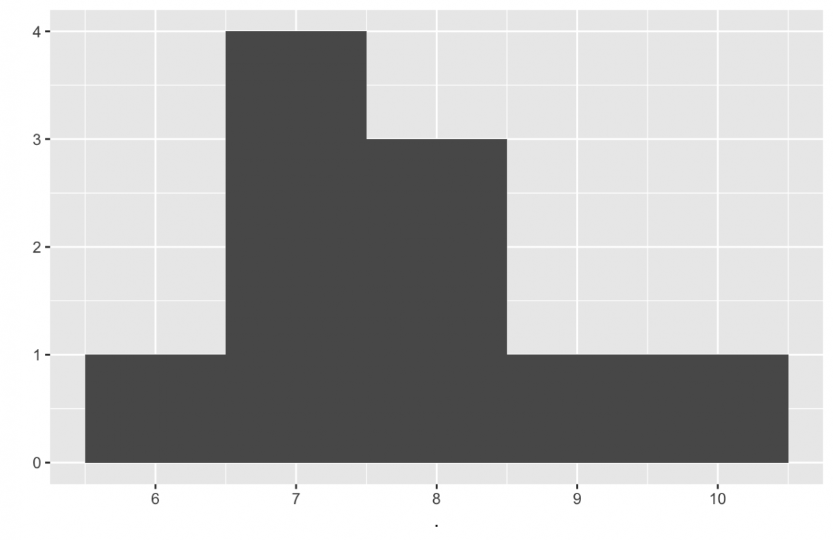 The histogram displays a symmetrical distribution of data. A distribution is symmetrical if a vertical line can be drawn at some point in the histogram such that the shape to the left and the right of the vertical line are mirror images of each other. The mean, the median, and the mode are each seven for these data. This example has one mode (unimodal), and the mode is the same as the mean and median. In a symmetrical distribution that has two modes (bimodal), the two modes would be different from the mean and median. In a perfectly symmetrical distribution, the mean and the median are the same. What does this tell us about the mass variable recorded in the starwars dataset?