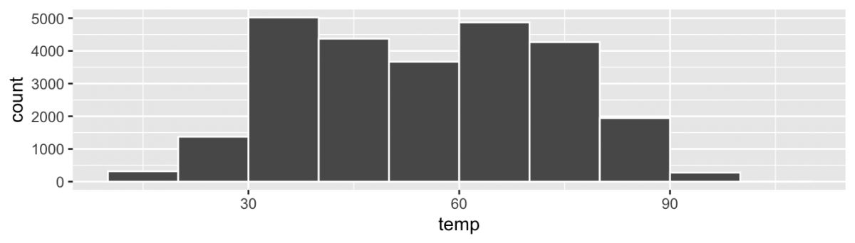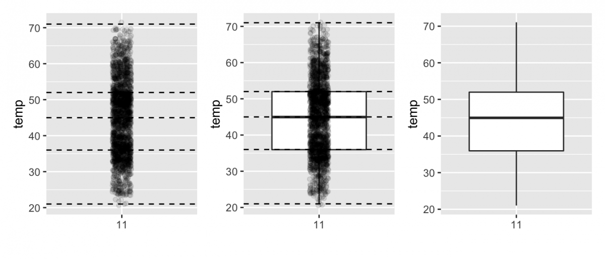 Furthermore, in the rightmost plot, we see the whiskers of the boxplot. The whiskers stick out from either end of the box all the way to the minimum and maximum observed temperatures of 21°F and 71°F, respectively. However, the whiskers don’t always extend to the smallest and largest observed values as they do here. They in fact extend no more than 1.5 * from either end of the box. This should sound familiar! Any observed values outside this range are suspected to be outliers and get marked with points.