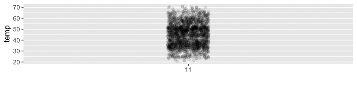 Let's back up even further than histograms and look at a scatterplot; to keep things simple for now, let’s only consider the 2141 hourly temperature recordings for the month of November, each represented as a jittered point.