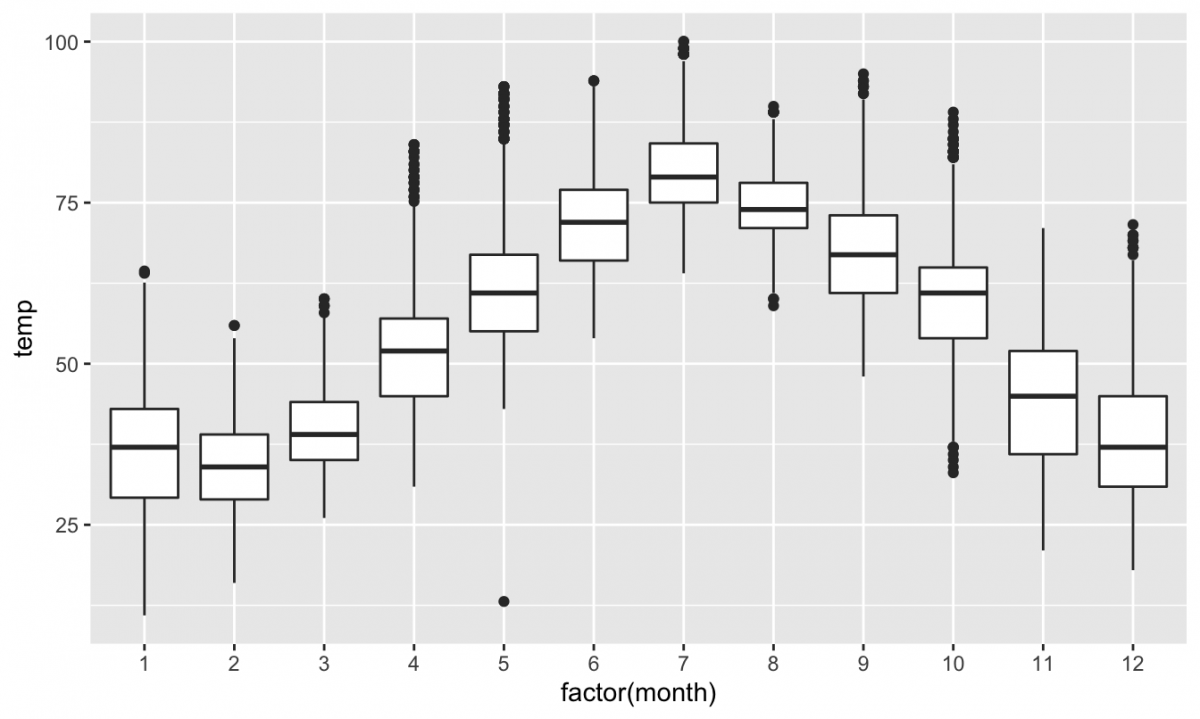 Here's another boxplot that marks outliers in that way; it also takes a look at all twelve months of the year, in a way that really demonstrates the power of quantiles and boxplots: