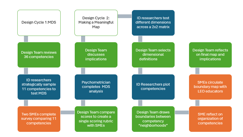 This design study comprises two related phases that supported the LEO-TC administrators in organizing, updating, and communicating decision-making around the curriculum. The first cycle focused on developing MDS methodology as the initial SME competency rating survey. The MDS analysis results offered a baseline understanding for the second design cycle, which focused on iterative mapping exercises. The design cycles provide a methodology that makes SME judgments visible and supports negotiating and meaning-making across the design process. The following sections describe the methods in general, while the individual findings will provide the technical details of each step.