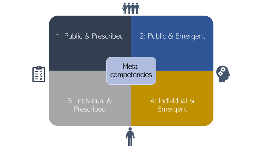 Note. Figure 6 illustrates that the MDS analysis revealed two clear dimensions. Organizing the competencies into quadrants highlights spectrums of activities: from public to individual (y-axis) and from prescribed to emergent processes (x-axis). The central position suggests A possible third dimension, representing meta-competencies that SMEs found relevant across all quadrants.
