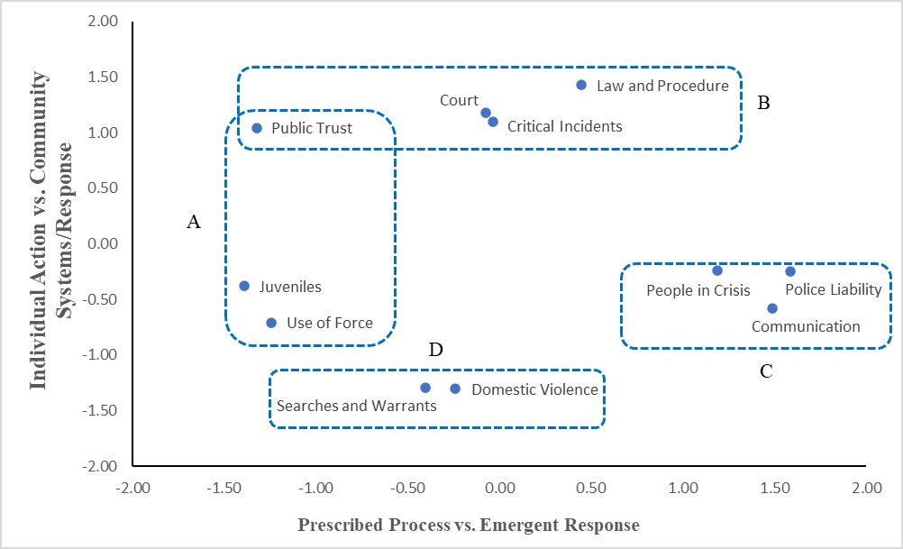 After the MDS analysis, the design team determined that two dimensions were most meaningful. Through several discussions, the team iteratively developed themes for these dimensions: the first dimension (horizontal axis) was prescribed process vs. emergent response of law officers, and the second dimension (vertical axis) was individual action vs. community systems/response. To clarify these axes in the curriculum context, designers facilitated a discussion with SMEs to create a heuristic description for each quadrant.