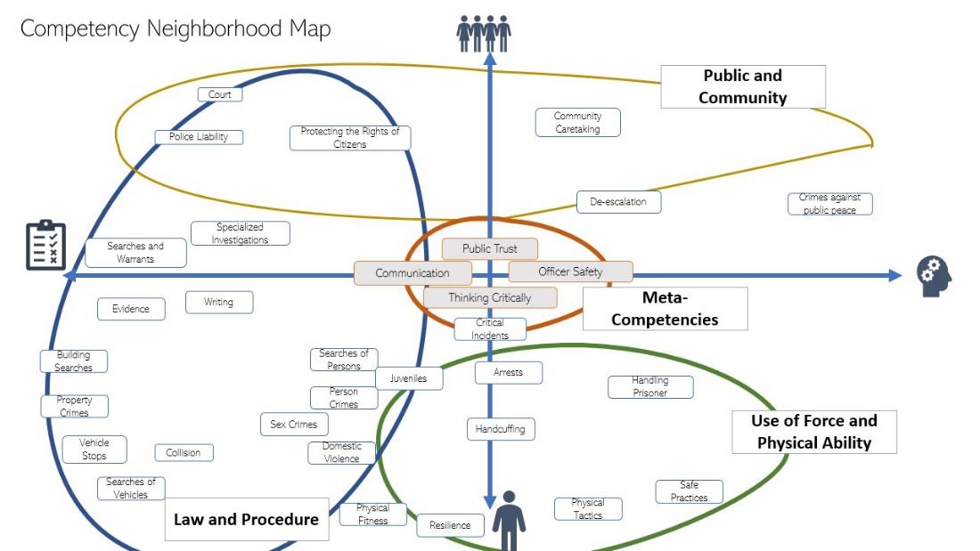 After the competencies had been placed, as shown in Figure 7, our SMEs guided drawing boundaries to create groupings of “neighborhoods” or themed competency categories. As shown in the maps, competency neighborhoods extend beyond and across quadrants. These four neighborhood clusters are labeled Public and Community, Use of Force and Physical Ability, Law and Procedure, and the Meta-competencies, which operate at a different assessment and skill level. As the largest neighborhood, Law and Procedure could be further organized into four sub-neighborhoods. The final version of the competency neighborhood map makes visible to stakeholders how the curriculum developers (our SMEs and raters) intended the competencies as clusters of knowledge, skills, and abilities to work together relationally.
