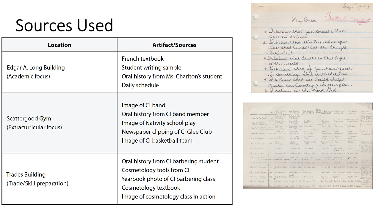 Housed within these buildings were artifacts including oral histories, student work samples, school documents, textbooks, and photographs that students analyzed on site using SCIM-C. Special attention was made in the design of CI Spy to include sources representative of a range of student reading abilities and included visual images and brief text documents along with more complex, extensive text documents (Figure 3).
