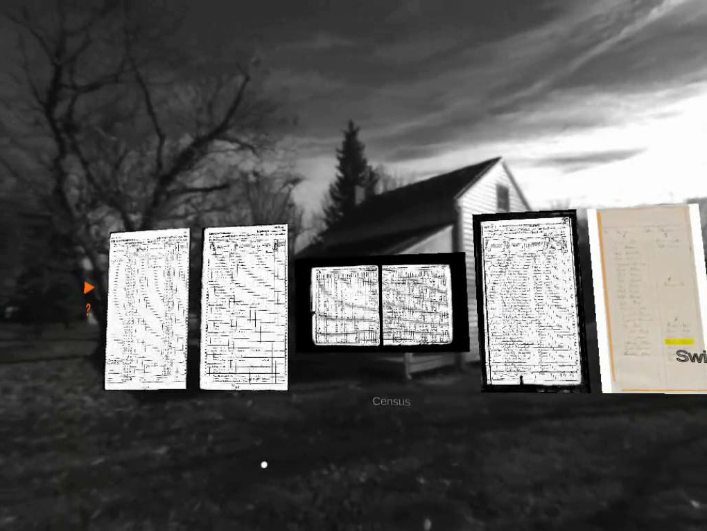 From an information presentation perspective, decisions had to be made about how best to display our mainly document-based sources for not only readability but also context. The site is much more confined than Christiansburg Institute, for example, but has multiple structures that were leveraged to provide physical context to the sources. Several designs were tested, with early designs attempting to ground the documents and maps on virtual tables or stands, but we settled on a free-floating presentation of the sources at eye-level to be selectable by the user (Image 4), allowing them to focus on what they wanted to explore (Gutkowski et al., 2021).