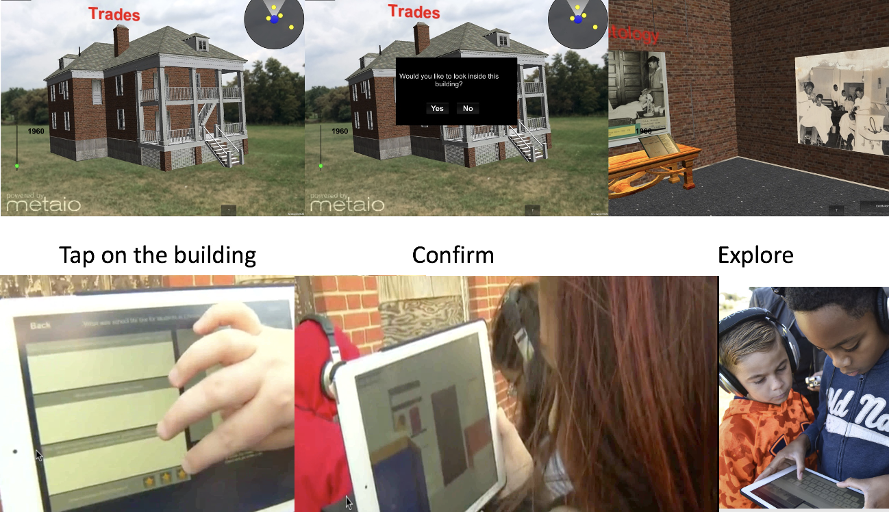 In this project, students explored the site using mobile AR (tablets) with historic sources located at important locations around the site, using an explicit scaffold to make evidence-based claims about this historic school. While the field trip was part of a larger unit introducing historical inquiry through the lens of civil rights, the CI Spy experience was designed to be a standalone activity, focusing on a hidden local history. The children had 40 minutes on site for a tightly focused and guided field inquiry. The less the students knew about CI prior to the field trip, the better, as “engagement first” served as the epistemological frame for inquiry.