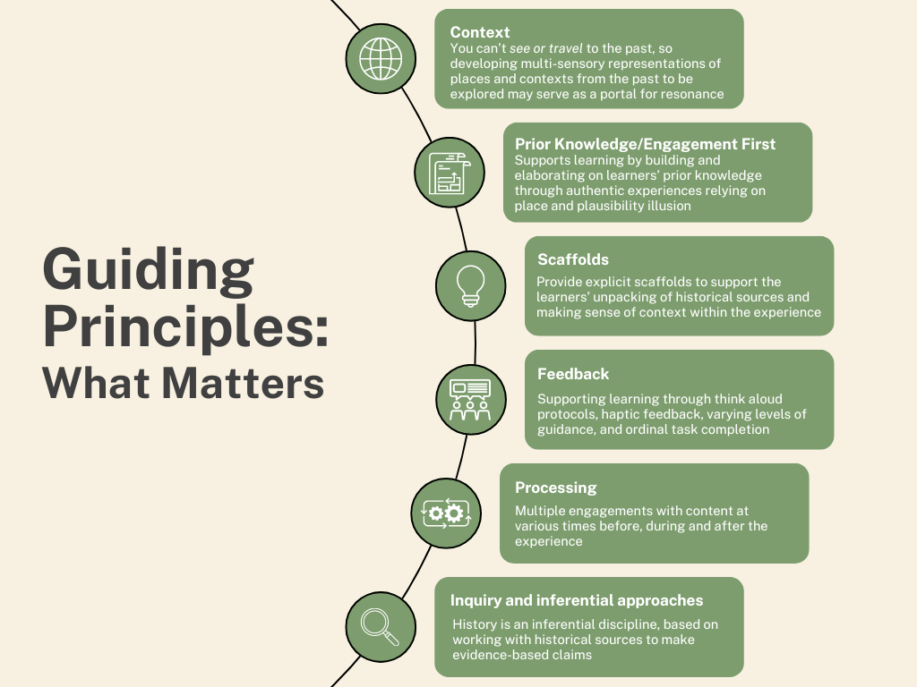 Pedagogically, we feel it is critical to maintain attention on the principles of learning you choose to employ (for example, we know we must provide sources and a scaffold for interrogating those sources), controlling pacing, and how much guidance you provide. With a well-planned inquiry, sustaining that inquiry is important. XR for history education does not function without well planned pedagogy, but with that planning and support in place, it can: