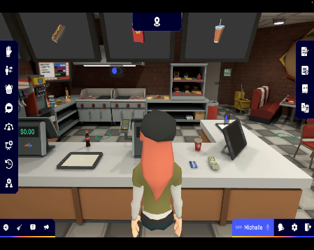 The second principle focused on designing tasks that emphasized interaction among the learners through the context. Through actively exploring and manipulating objects in task completion, students could gain a better understanding and knowledge transfer (Johnson et al., 2016). Before starting the tasks, students explored the VR learning environment and interacted with virtual objects by themselves. For instance, they used a scanner to scan objects and learn vocabulary and pronunciation. They also manipulated objects, like eating hamburgers at McDonald’s or blowing a trumpet at a shopping mall. This interaction made the experience more realistic and enjoyable. As students engaged in completing the tasks, they were encouraged to interact with objects to make the learning experience authentic. For example, while ordering food in a restaurant, one student acted as a customer reading the menu, while the other played the waiter bringing food and drinks. As interacting with virtual objects requires active participation, prompting learners to describe, explain, and discuss their actions, it could help practice their speaking skills. Additionally, students interacted with each other through the context by assisting peers struggling with interactions, which provided more opportunities for speaking practice and collaborative learning.