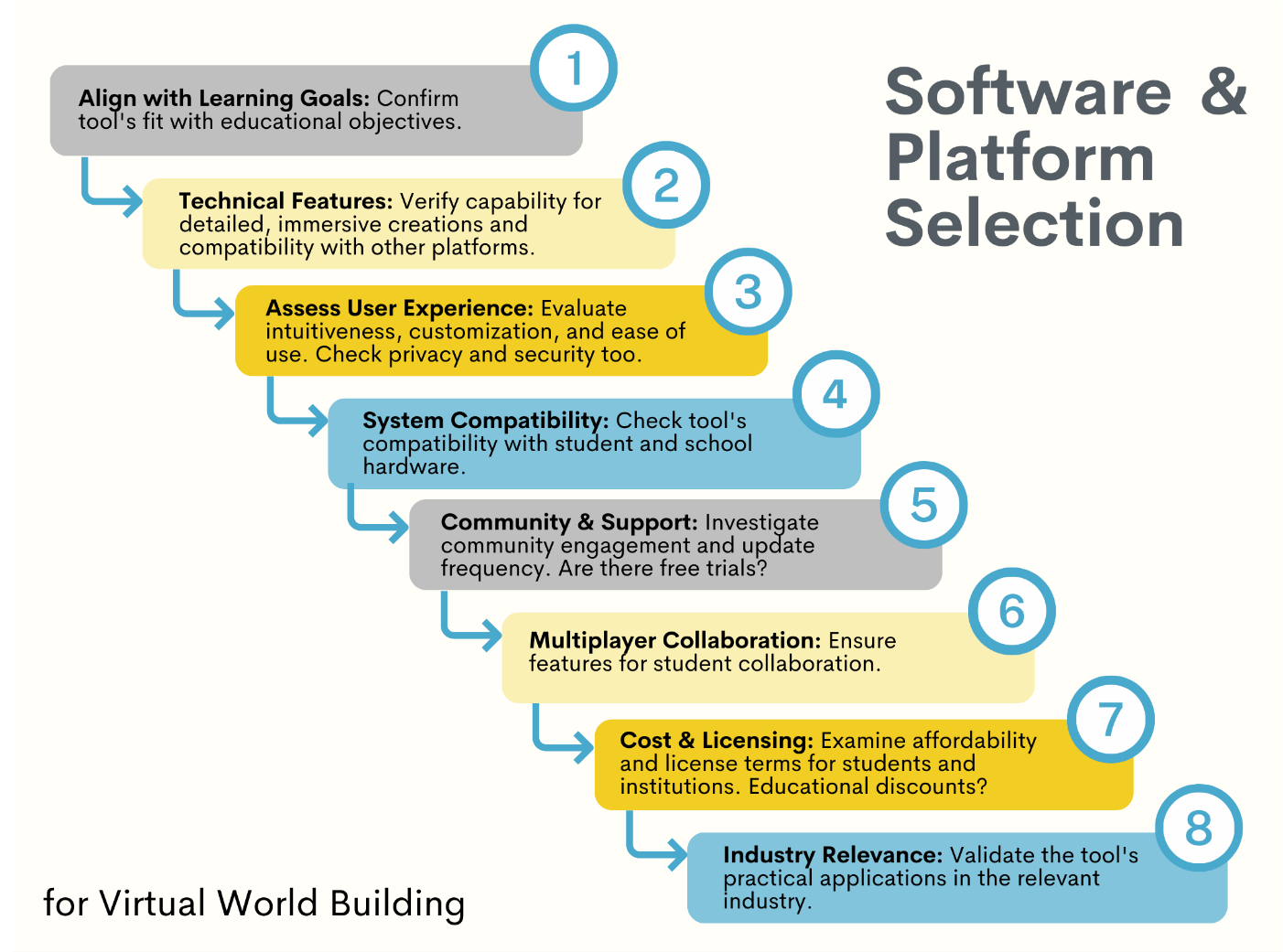 Another complicating factor for the application of problem-posing education and transformative learning to XR education arose from the rate of change in the subject matter. During our year of design, teaching, and research, we witnessed major changes to the most available, relevant, and usable XR technologies.  We propose the following method in Figure 3 for assessing and learning disruptive technologies of any kind. Our framework might be used by instructors and course designers to plan, but also by students to compare and learn different tools as a recurring learning process. Rather than focusing on the tools themselves, this approach empowers both instructors and learners to evaluate, choose, and create with technology. For entrepreneurs, the ability to identify and skillfully utilize the right tools effectively and efficiently stands out as a distinct advantage, distinguishing them from the competition.  Knowing how to choose the right tool is a key component often missing from the technological literacy necessary for success across many contemporary industries and disciplines.