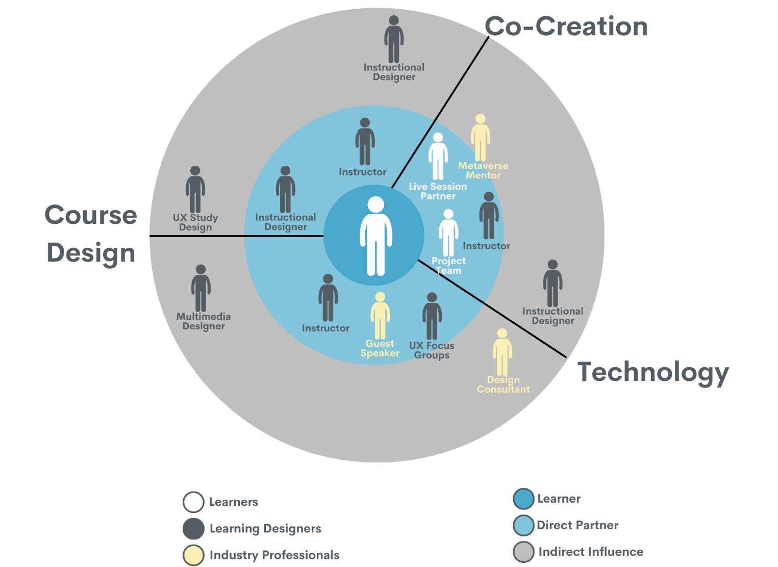 The ethos of Web3 is decentralized and peer-to-peer. This non-hierarchical trend echoes the combination of instructional design principles we found most effective in this project, which, in their combined use, facilitate a form of decentralized pedagogy. While problem-posing education’s call to restructure the teacher-student relationship (Freire et al., 2014) is an important starting point, learning experiences cannot effectively position students as creators or emerging experts without a human-centered approach to identifying their needs. Static subject matter expertise is not agile enough to empower students in a dynamic landscape, so in this project, effective XR learning required partnership between instructional designers, user experience researchers, media designers, 3D artists, and metaverse practitioners. When possible, we practiced transparency regarding the collaborative ecosystem of this design, with instructional and multimedia designers engaging directly with students. These layers of collaboration and co-learning positioned instructors to facilitate rather than transmit expert knowledge. To effectively apply Freire’s model to the realities of disruptive technologies as subject matter, universities and departments need to develop intentional pathways for collaborative instructional design.