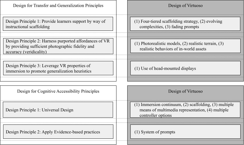 Promoting acquisition and generalization of skills for individuals severely impacted by autism using immersive technologies (Schmidt et al., 2020) | Design & Construction | Design paper explicating heuristics to use VR technologies to promote generalization for autistic learners | |