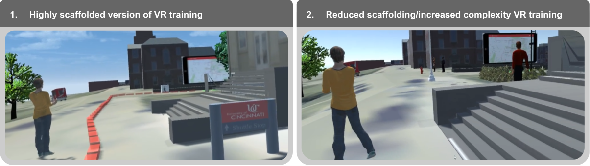 After engaging with the technology-supported aspects of the training, participants practiced the steps they had learned in the real world. Transitioning from virtual to real environments allowed participants to apply their newly acquired transportation skills in practical settings. The systematic approach, from scaffolded learning in virtual scenarios to real-world application, ensured efficient skill acquisition and provided a safe space to learn and practice before facing real-world challenges. The systematic scaffolding approach used in Virtuoso was implemented with a high degree of implementation fidelity, which facilitated the acquisition of transportation skills in an efficient and tailored manner while providing the ability to safely learn and practice associated skills in an XR modality before practicing these skills in the real world.