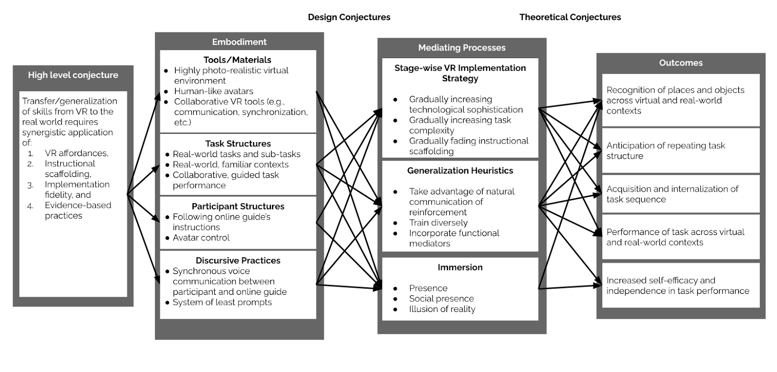 This is complemented by participant structures promoting active engagement and discursive practices encouraging communication between users and guides. The mediating processes advocate for a staged VR implementation strategy, emphasizing the gradual enhancement of VR complexity and a reduction in guidance, fostering independence. The program's anticipated outcomes include improved recognition of real-world objects and environments, anticipation of task structures, and mastery of task sequences, culminating in a heightened sense of self-efficacy and autonomy in the actual task execution. Taken together, the conjecture map presented in Figure 5 provides a holistic ecology for understanding the design, implementation, and expected outcomes of a VR learning environment, which incorporates the design principles discussed in the previous section. Overall, the conjecture map provides a detailed and structured overview of how various elements of the VR learning environment are theorized to interact and contribute to effectively transferring skills from the virtual to the real world.