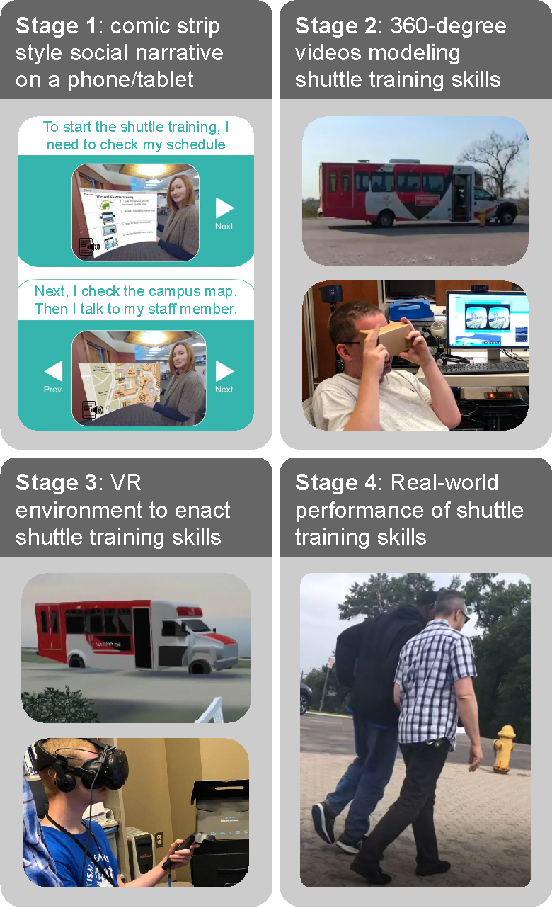 Virtuoso training was structured around teaching autistic participants how to utilize the university shuttle system, a vital aspect of their vocational training. The shuttle provided gratis access to various routes within the campus and the surrounding community. The shuttle system also utilized a mobile phone-based tracking app, making planning and monitoring rides possible. The training was characterized by three salient features: (1) an instructional scaffolding system, (2) a highly proceduralized set of instructions for catching the shuttle, and (3) a four-stage system of technology supports. First, the design of instruction involved a carefully articulated scaffolding system characterized by a gradual transition from a higher level of support to a lower level of support. Second, the training utilized a four-step procedure, derived from procedural task analysis (Jonassen et al., 1994), for catching the shuttle in which participants (1) checked the shuttle schedule, (2) viewed their route to the shuttle on a map, (3) walked to the shuttle stop, and (4) boarded the shuttle (Schmidt et al., 2023a). Third, a four-stage system of technology supports (Figure 1) was used to introduce the skill, model the skill, allow for rehearsal in the XR space, and practice the skill in the real world (Schmidt & Glaser, 2021a).