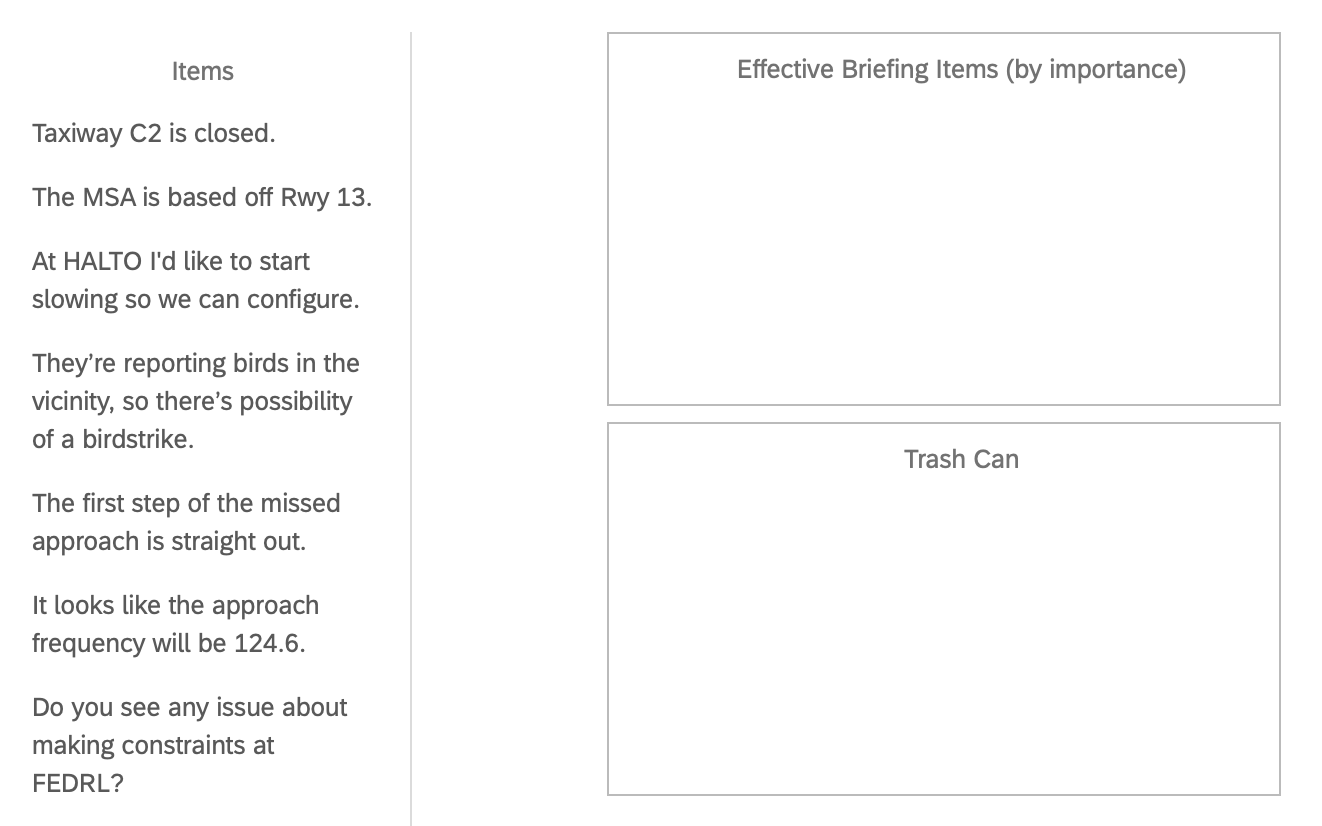 Like the generative tasks, the review tasks involved two parts: a briefing and then a reactive action plan. The same scenario was used for these review tasks as was used for the generative task within each version of the assessment. Participants then sorted briefing or action plan items into “effective items” or a trash can and ordered the effective items by importance (see Figure 3).