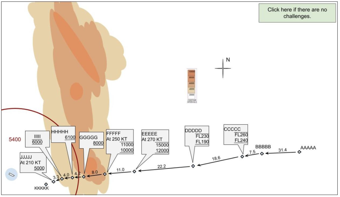 The arrival chart analysis tasks included three simplified charts, one with steep sections and a shortcut, one with steep sections and terrain, and one with no challenge, to use as a control for guessing. In Figure 4, the high terrain can be seen in orange, and there is a steep section from GGGGG to JJJJJ. It should be noted participants were also given the option to say there were no challenges present in the chart.