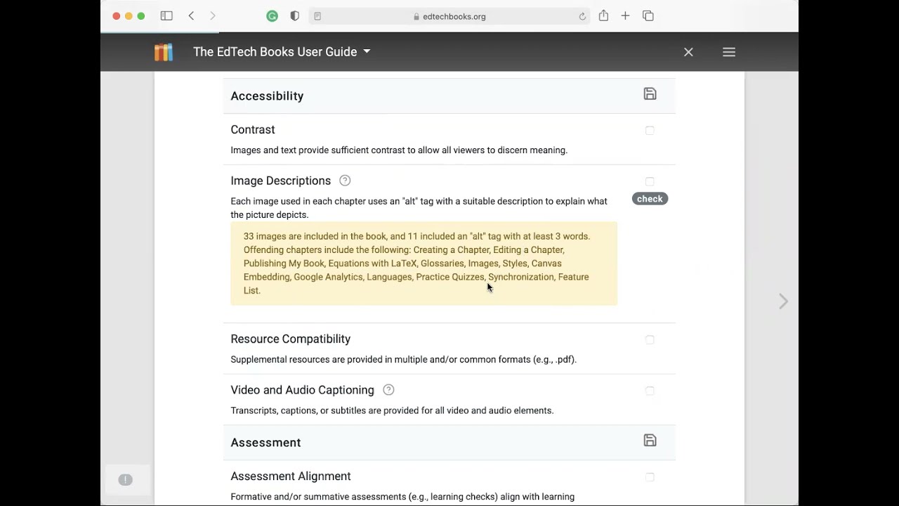 To ensure the quality of your book and its individual chapters, we provide a checklist for you to use as you prepare to publish your book on EdTech Books. To learn more about how to find and use the Quality Assurance Checklist, watch the video below.